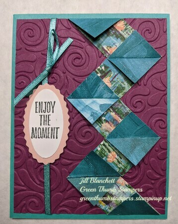 Stampin' UP designer series papers are perfect for this chevron strip card. The double oval punch and Enjoy the Moment stamp set from the new Stampin' UP! mini catalog were also used.